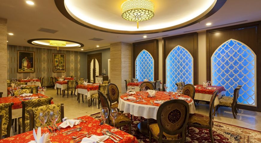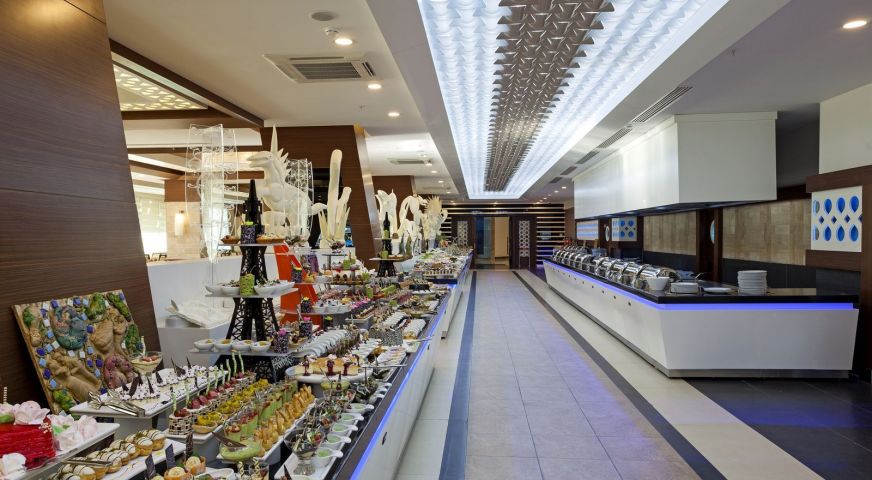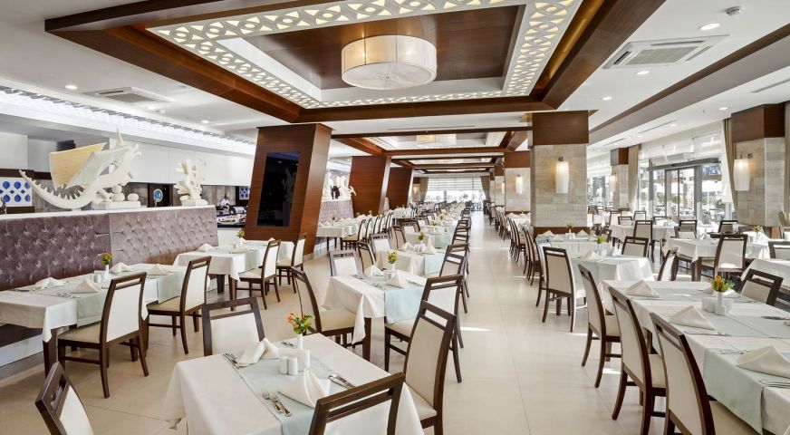 Основен ресторант - отворен бюфет. А ла карт ресторанти - рибен и италиански; сладкарница. Барове - лоби бар, снек бар, бар на плажа.