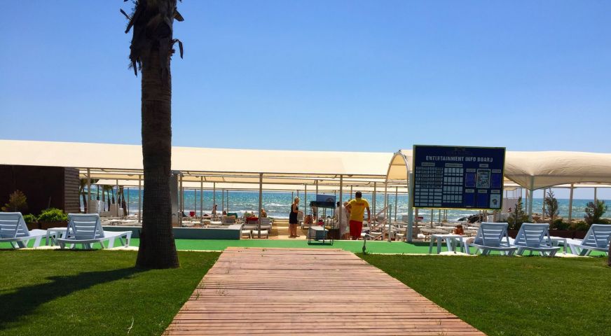 Плажът е на 300 м. от хотела, собствен пясъчен.