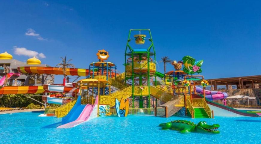 Комплексът предлага разнообразие от услуги и съоръжения, включително просторна градина, открити басейни, водни пързалки, основен ресторант, няколко бара, амфитеатър за анимация, тенис корт, мини голф и магазини. Подходящ е както за семейна почивка, така и за двойки.