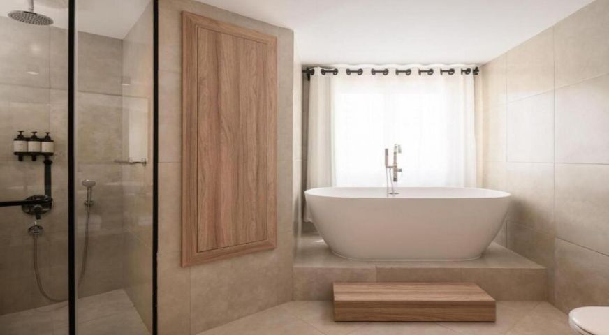 - Голям самостоятелен душ тип тропически дъжд и тоалетна