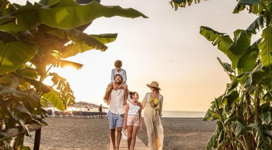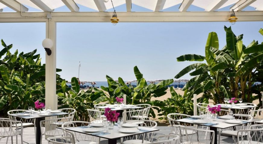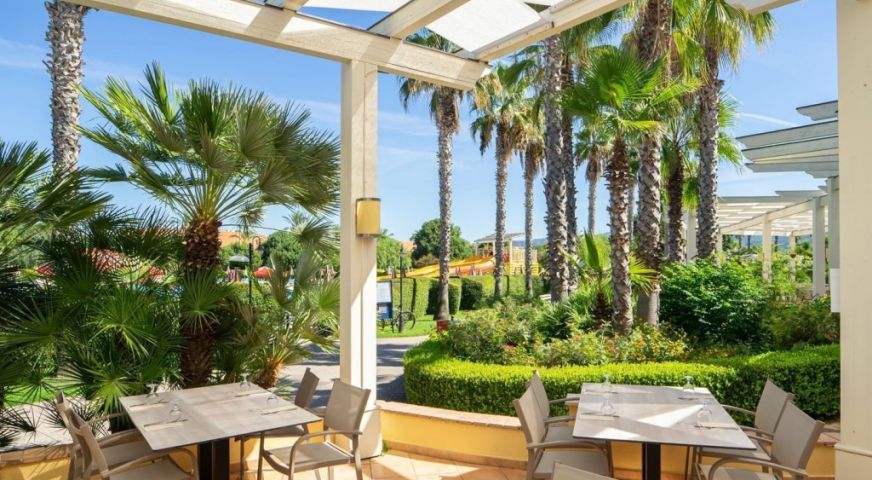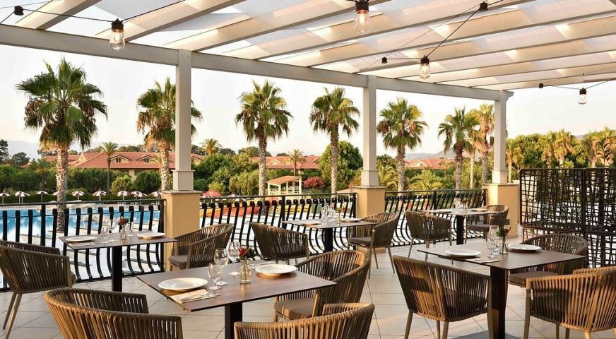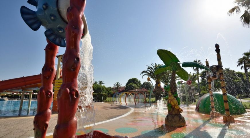 На територията на хотела: На своите 124 хиляди кв.м площ, хотелът разполага с 5000 кв.м басейни, водни пързалки, спрей парк, собствен плаж с чадъри и шезлонги, СПА и красива борова гора между хотела и плажа. 3 бюфет-ресторанта, 1 а ла карт, барбекю и бар на плажа, общо 4 бара и кафе-сладкарница. Хотелът предлага средиземноморска и интернационална кухня и проявява специални грижи за туристи с алергии или такива на специален режим (необходимо е уведомление). Acquapura SPA , възползвайте се от различни масажи и козметични процедури, фитнес зала, сауна, зона релакс. Игрища за тенис и плажен волейбол. Амфитеатър за вечерни забавления и музика на живо.