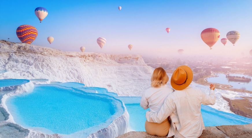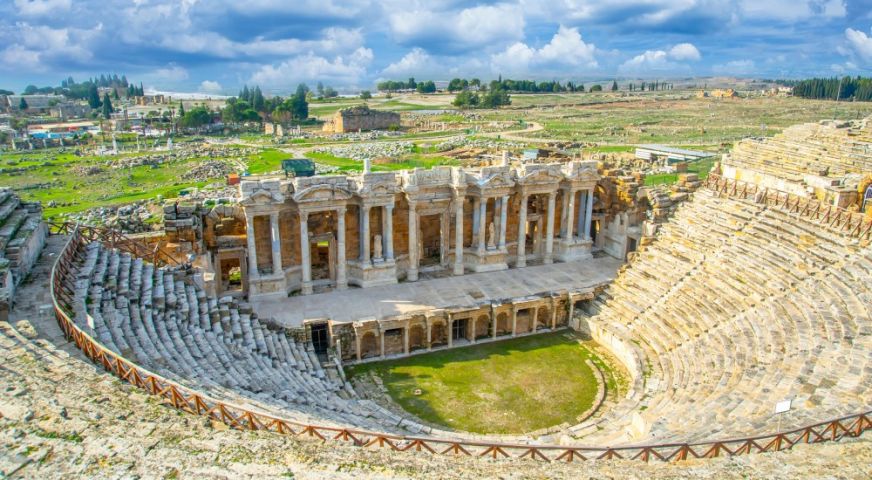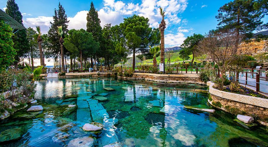 Пътят до Памуккале (дворец на памука) минава през прекрасна меандрова долина. Типичните за местния пейзаж снежнобели калциеви каскади са възникнали от отлагания на течащите по скалите термални води. Още от древността благодарение на този очарователен природен декор на извора се приписват лечебни свойства. По-късно ще посетите руините на бляскавия древен град Хиераполис, преживял своя разцвет в римско време, простиращи се над калциевите каскади. Тук се намират основите на храма на Аполон от III в. от н. е. Римският амфитеатър е красив и внушителен със своите петдесет стъпаловидни реда от травертин. След настаняването ще имате възможност за топла баня във вашия термален хотел.