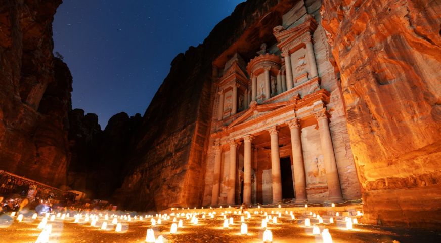 Закуска. Напускане на кампа. Отпътуване за целодневна екскурзия до Петра – уникален град, изсечен в скалите, свещен град на набатейците, заселили се тук преди повече от 2000 години, превърнали го в център на всички търговски пътища, свързващи Изтока със Запада. Избрана за едно от новите седем чудеса на света, Петра е безспорно един от най-впечатляващите и богати архитектурни комплекси, включена в списъка на ЮНЕСКО за Световното културно и природно наследство. Посещението на Петра започва с разходка през прохода Сик - тясно, сенчесто ждрело между две надвиснали скали. В края на този проход се разкрива смайваща и магическа гледка през пролуката - съкровищницата „Ал Хазне“, владетелска гробница на набатейците в класически гръцки стил, изсечена в огромната лицева част на 39-метрова скала.Това е най-добре запазената фасада в Петра и се смята за шедьовър на набатейската цивилизация. От съкровищницата започва главният път, който постепенно ще разкрие мистериите на този древен град - т. нар. „Улица на фасадите“, Амфитеатърът - единственият в света, изсечен в скала, владетелските гробници и Набатейският храм. Над комплекса се извисява манастирът „Ад Деир“, до който се стига по 800 стъпала. Късно следобед отпътуване към столицата Аман. Настаняване. Вечеря. Нощувка.