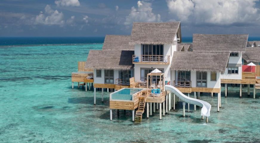 1 Two bedroom lagoon pool villa with slide (234 м2) - Разполага с басейн (24 м2) на верандата, хол на първия етаж с изглед към океана и с 2 големи бани.