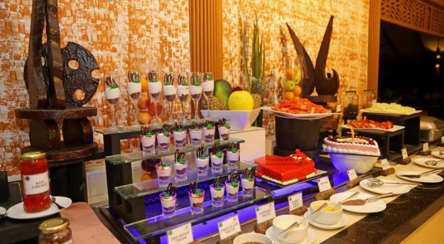 На територията на хотела: Хотелът разполага с открит отопляем басейн, основен ресторант Mela с бюфет, ресторант Blitz по меню, основен бар и бар на плажа. Безплатен Wi-Fi е наличен в целия хотел. Хотелът разполага също с пералня и конферентна зала от 24 кв. м.