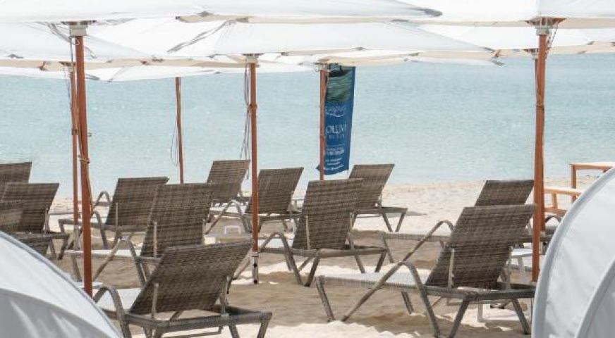 Собствен, пясъчен. Чадъри и шезлонги на плажа и при басейна - безплатно.