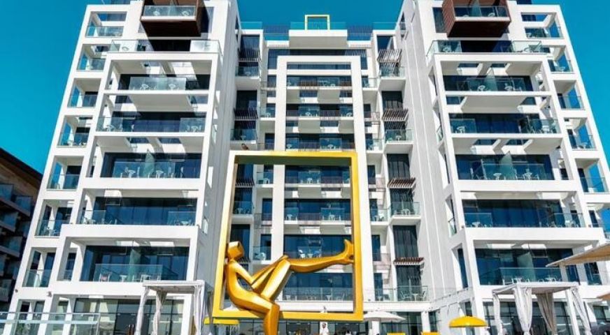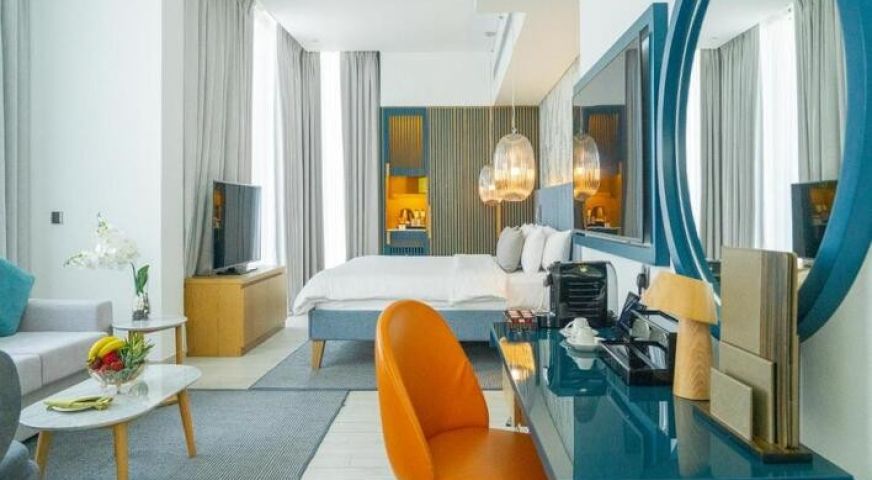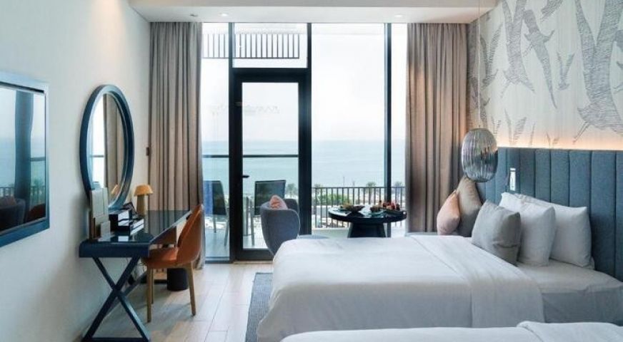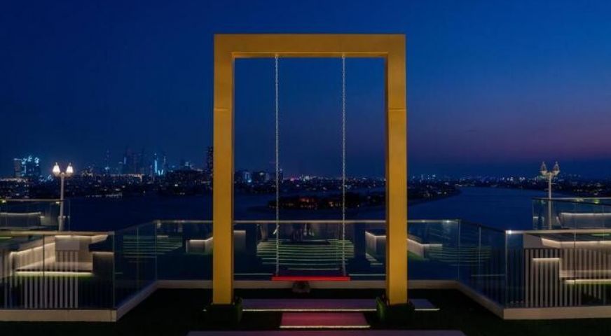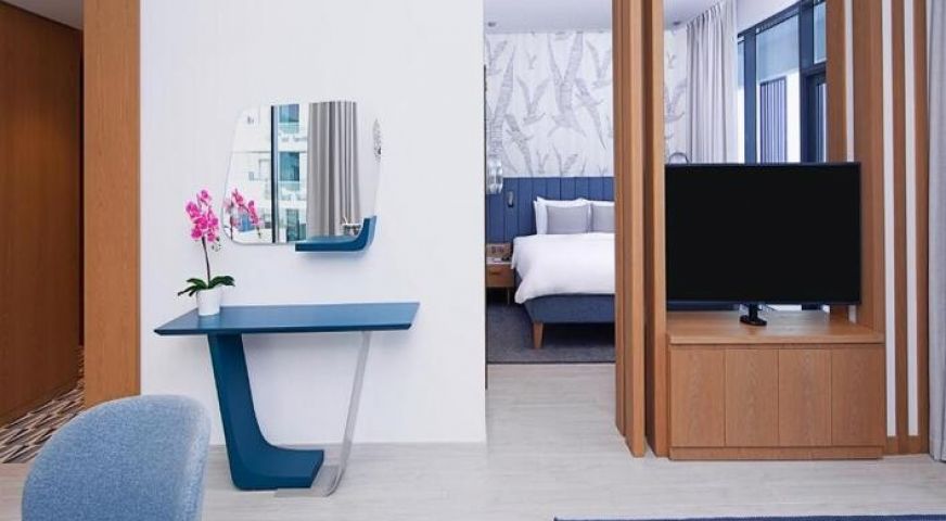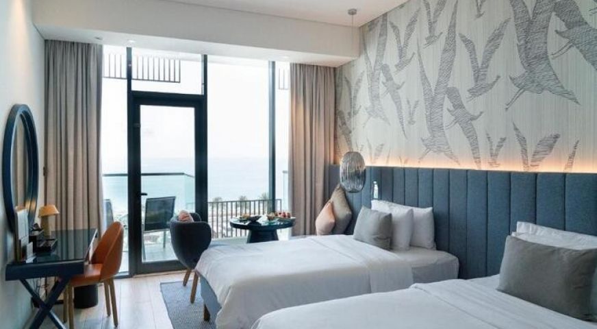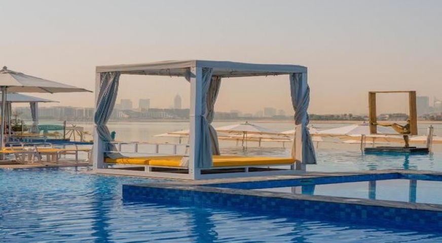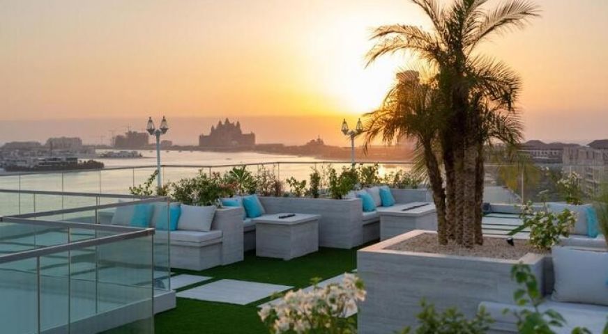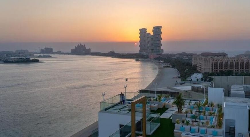 Хотел и курорт на брега на морето с изглед към Арабско море, с луксозни стаи и апартаменти, които се отличават със съвременен декор, драматично стенно изкуство, плоски екрани и стъклени балкони с гледка към океана и Палм Джумейра.