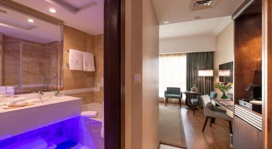 В стаите: Стаята разполага с халат и чехли, тоалетни принадлежности, сешоар, телевизор, телефон, минибар, бутилирана вода, удобства за приготвяне на чай и кафе, ютия с дъска за гладене, Wi-Fi и сейф.