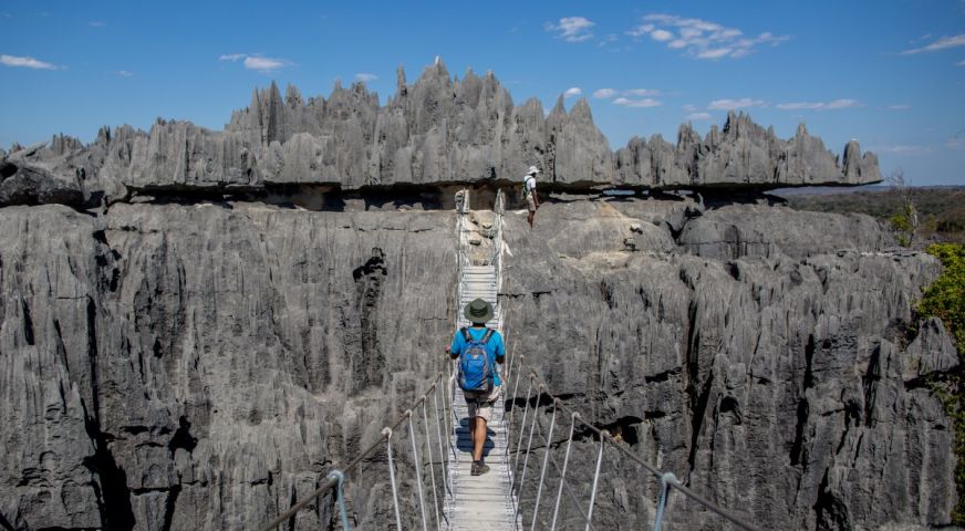 Закуска. Отпътуване към река Манамболо, където ще се качите на традиционна пирога за вълнуващо откритие на каньоните на Манамболо. Ще изследвате пещери, украсени със сталактити, и ще видите древни гробници на вазимба - първите обитатели на тези скални образувания. След това продължаване към Големите Цинги в ''Национален парк Цинги де Бемараха'' - геоложки шедьовър, включен в списъка на световното наследство на ЮНЕСКО.Тези гигантски варовикови катедрали, оформени от стръмни разломи и остри върхове, предлагат зашеметяваща гледка. Разходката ви ще премине по висящи мостове и дървени пътеки, откривайки внушителни панорами на този минерален лабиринт. Това е предизвикателен, но незабравим маршрут, който ще ви потопи в сърцето на една дива величествена природа. В края на деня - връщане в хотела за заслужена почивка и вечеря. Нощувка.