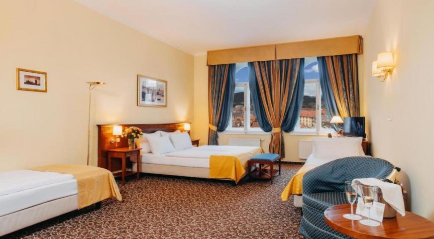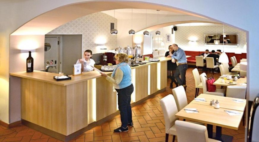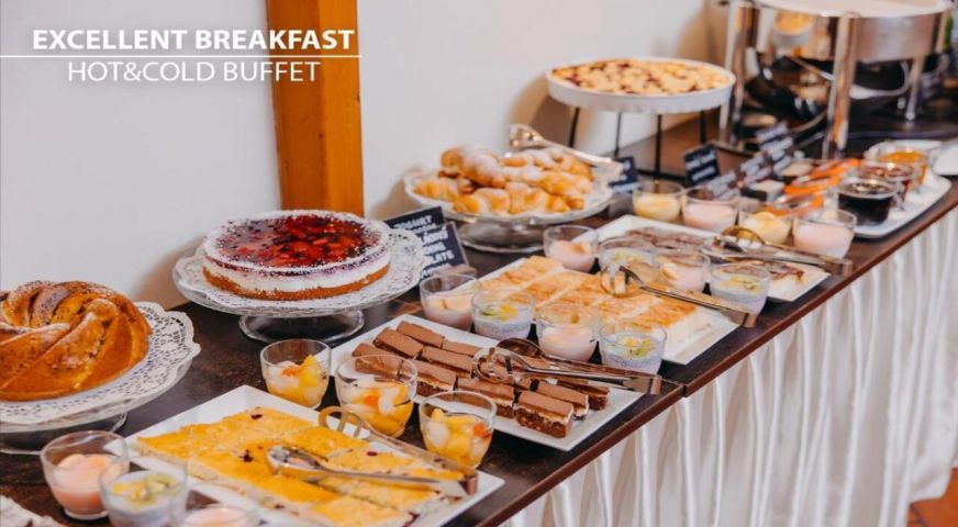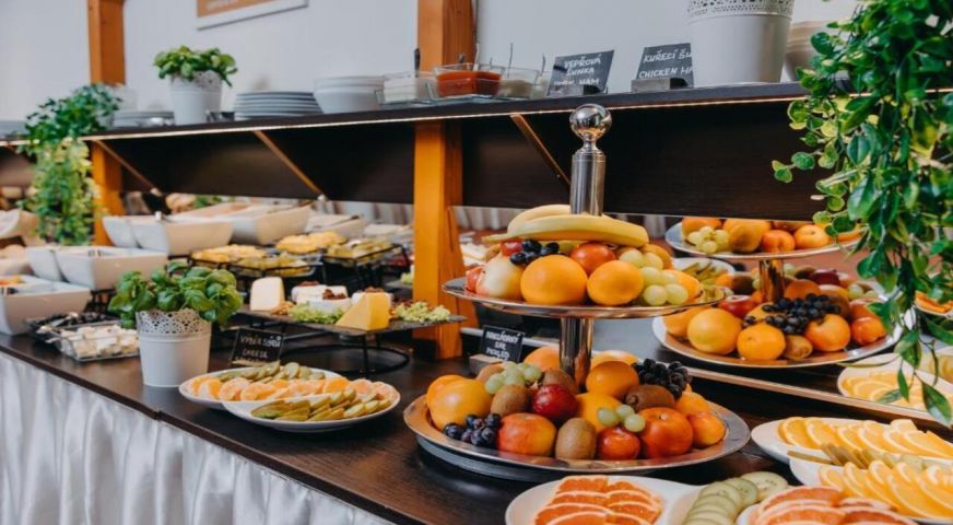 Ресторантът на хотела сервира изобилна закуска на шведска маса всяка сутрин, включваща както топли и студени ястия, така и традиционни чешки печива и напитки.