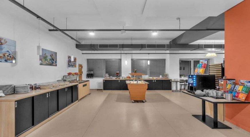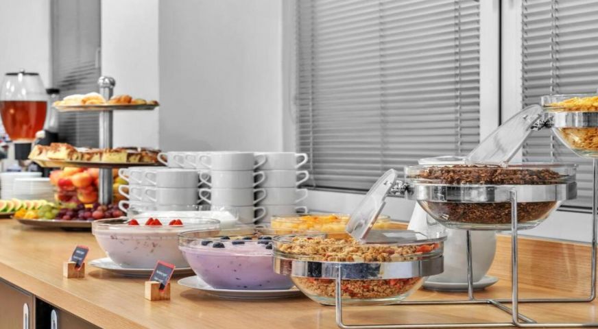Хотелът разполага със светла зала за закуска, където се предлага континентална закуска на блок-маса – хляб, масло, конфитюр, зърнени храни, колбаси, сирена, плодове, кафе, чай и сокове
