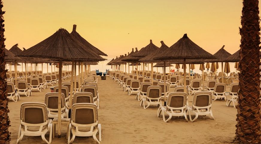 Собствен - пясъчен на 300 м от хотела. Чадъри и шезлонги на плажа и басейна - безплатно. Плажни кърпи - срещу депозит от 10 евро ( ежедневна смяна на кърпите - срещу заплащане 2 евро, безплатно се сменят на всеки два дни)