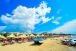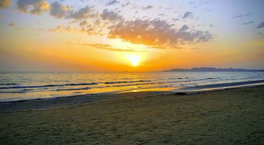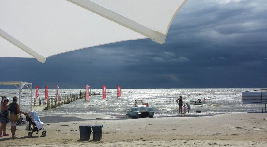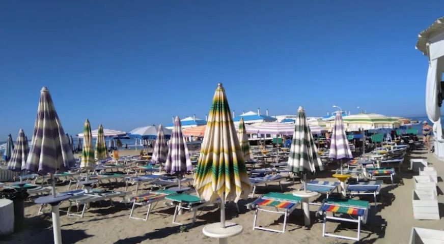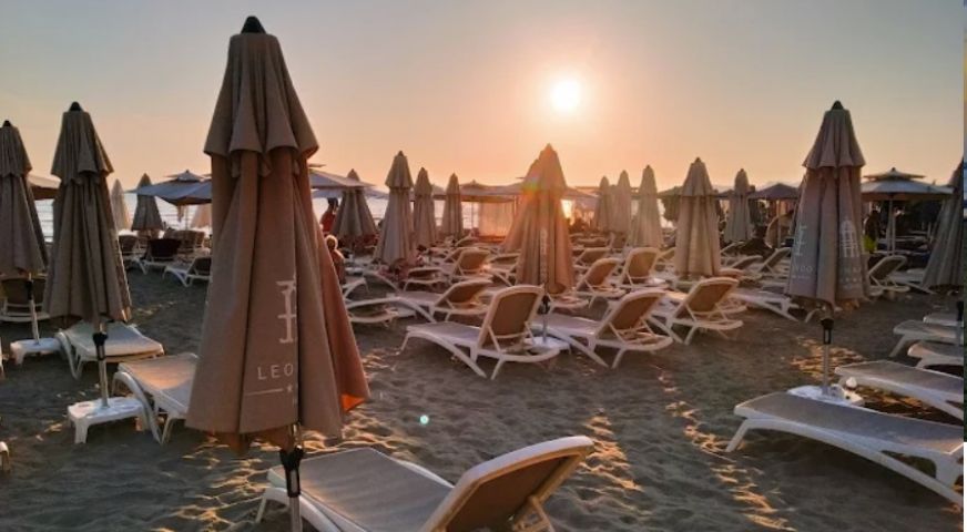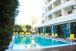 Собствен, пясъчен на 50 м. от хотела. Чадъри и шезлонги при басейна и на плажа - безплатно.