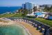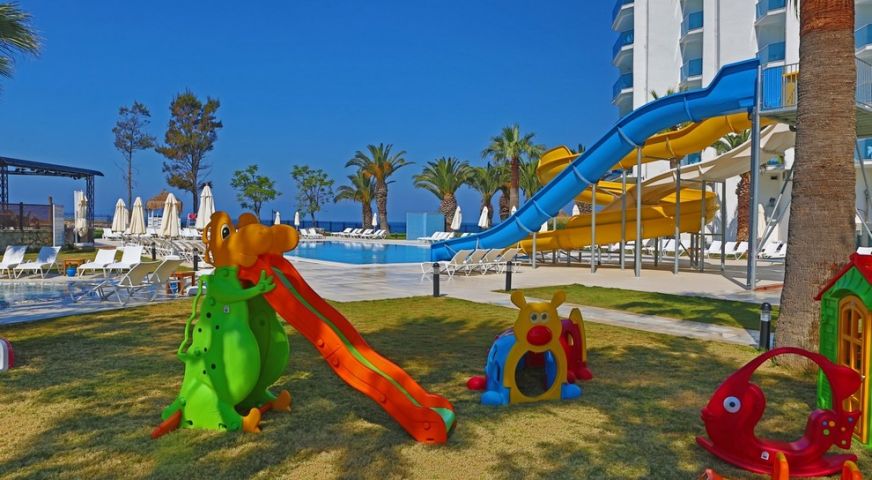 Хотелът има собствен малък естествен пясъчен плаж и платформа. За удобство на гостите предлага и два открити басейна с прясна вода: 300 кв.м, отопляеми от 15.03 до 30.03 и 264 кв.м, неотопляеми. Работно време на басейните: 08:00-19:30 ч. Водни пързалки, детски басейн (53 кв.м). Чадъри и плажа и при басейна – безплатно.