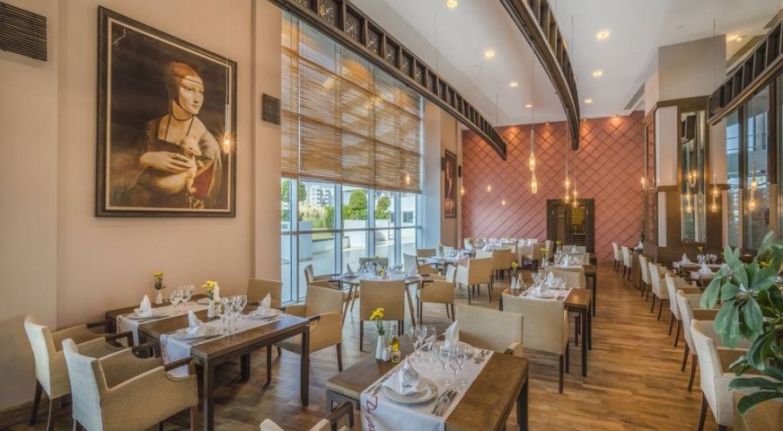 На разположение на гостите има основен ресторант и 7 а`ла карт ресторанта: Da Vinc - италиански ресторант, Asiana - далекоизточна кухня, Vinario Steak House (7+), Dafne - турска кухня, Poseidon - риба и морски дарове, BBQ - барбекю, Neyzen - традиционна кухня на Анталия. Всички ресторанти са отворени от 19:00 до 22:00 часа. Входът е платен, необходима е резервация. Освежаващи напитки и закуски се предлагат в 17 бара, в това число бар при басейна, бар на кея, снек бар, Coffee House, Juice Press & Smoothie. Барът при басейна работи денонощно. Основният ресторант разполага с блендер и микровълнова фурна за приготвяне на бебешка храна.