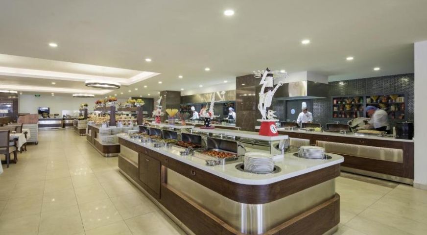 На разположение на гостите са основен ресторант за закуска, късна закуска, обяд, вечеря, късна вечеря. Между 12:30 и 16:00 ч. закуски се предлагат в снек бара. 3 а`ла карт ресторанта: италиански, турски и рибен. Разнообразни напитки се предлагат в 5 бара: бар на плажа, лоби бар (работи денонощно), London Bar, Relax Bar и диско бар.