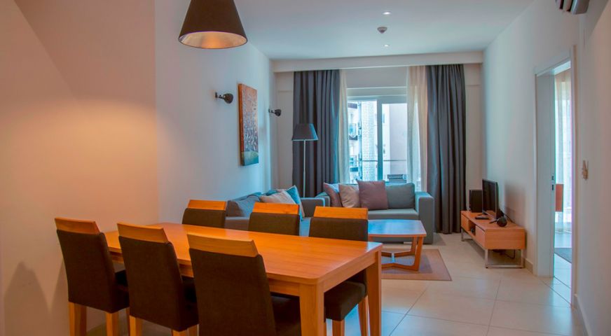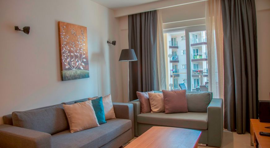 Хотелът се състои от четири сгради, в които са разпределени 443 климатизирани стаи, от които 288 Superior Room (34 кв.м), 63 Junior Suite Room (1 спалня, хол - 53 кв.м), 91 Family Suite Room (2 спални, хол, 2 бани - 71 кв.м) и 2 Handicapped (пригодени за хора с ограничена подвижност).Всички стаи са оборудвани с телевизор, телефон, сет за чай/кафе, минибар (безплатно еднократно зареждане с вода и безалкохолни напитки при настаняване), сейф (безплатен), баня с душ, сешоар, безплатни тоалетни принадлежности, балкон, Wi-Fi . Почистване на стаите – всеки ден, смяна на спалното бельо – 3 пъти в седмицата, смяна на на кърпите – 2 пъти в седмицата.