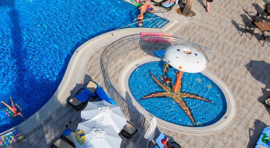 Собствен пясъчен плаж на около 400 м от хотела, автобус до плажа тръгва на около всеки 10 минути. 2 открити басейна (неотопляеми). 1 закрит басейн, отопляем от ноември до април, 200 кв.м, работно време 08:00-19:00 ч. 3 водни пързалки, работно време: 10:00-12:00 ч. и 14:00-16:00 ч. Работата на аквапарка зависи от метеорологичните условия.