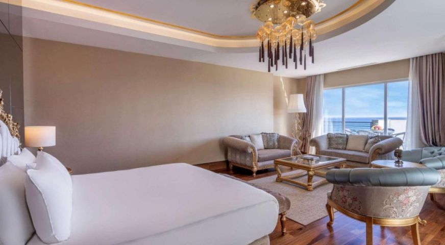 В стаите: Хотелът разполага със 181 стаи. Всички стаи са оборудвани с: централен климатик, телевизор, мини бар, баня с душ, сешоар, телефон, сейф. Всяка стая има балкон с изглед.