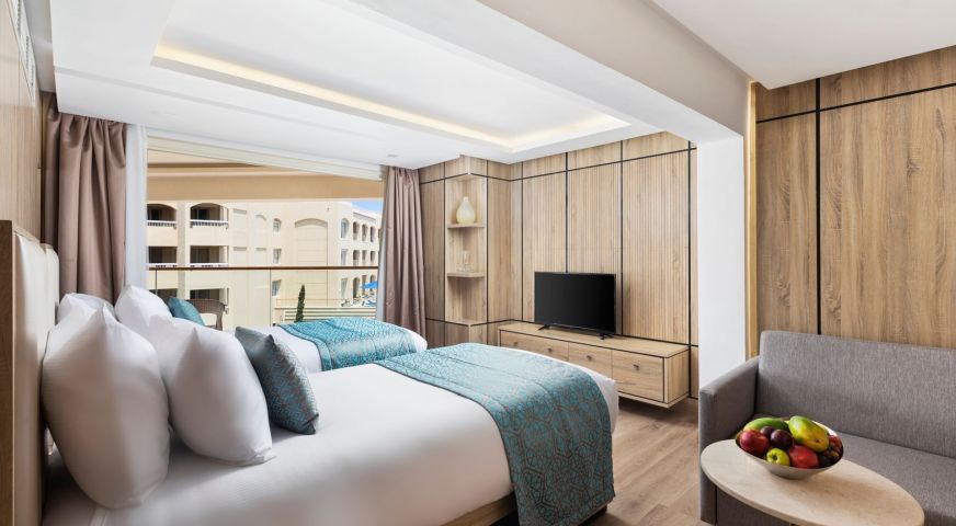 Хотелът разполага с общо 678 стаи, разположени в комплекс от двуетажни вили, основна четириетажна сграда и триетажен корпус. от които 374 Standart rooms (с изглед към градина, басейн или морето – 24 м2), 220 Standard bungalow rooms (с изглед към градина или море – 28 м2), 62 Family rooms (с изглед към градина, басейн или морето) и 22 Suites (с изглед към морето). Всички стаи са оборудвани с климатик, телевизор, телефон, баня с душ, сешоар, минибар (зарежда се всеки ден с минерална вода - безплатно), сет за чай/кафе, сейф, Wi-fi, балкон. Почистване на стаите и смяна на кърпите - всеки ден, смяна на спално бельо – 3 пъти в седмицата.