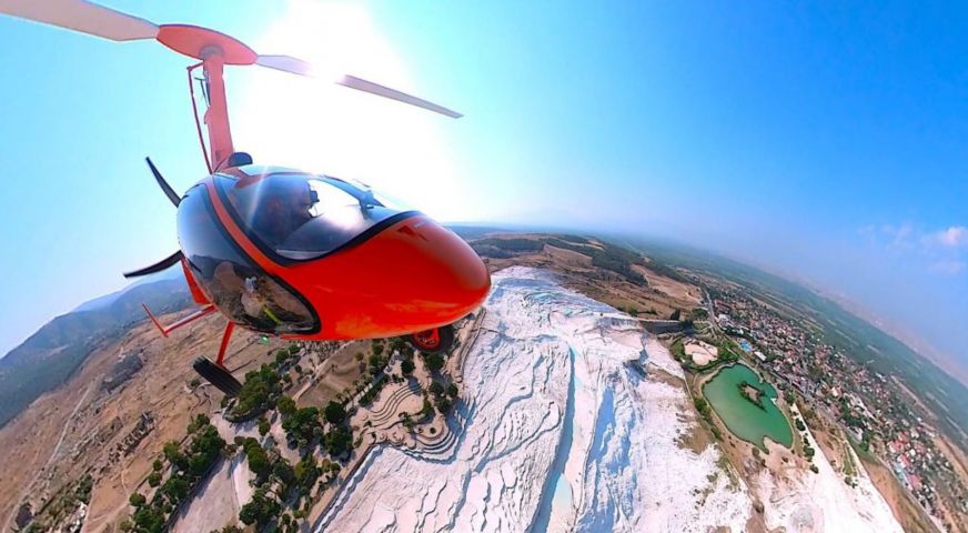 Полет с жирокоптер над природния феномен Памуккале и древния град Хиераполис. Ще получите инструктаж от лицензиран пилот и ще летите заедно с него, наслаждавайки се на красотите на района от птичи поглед.