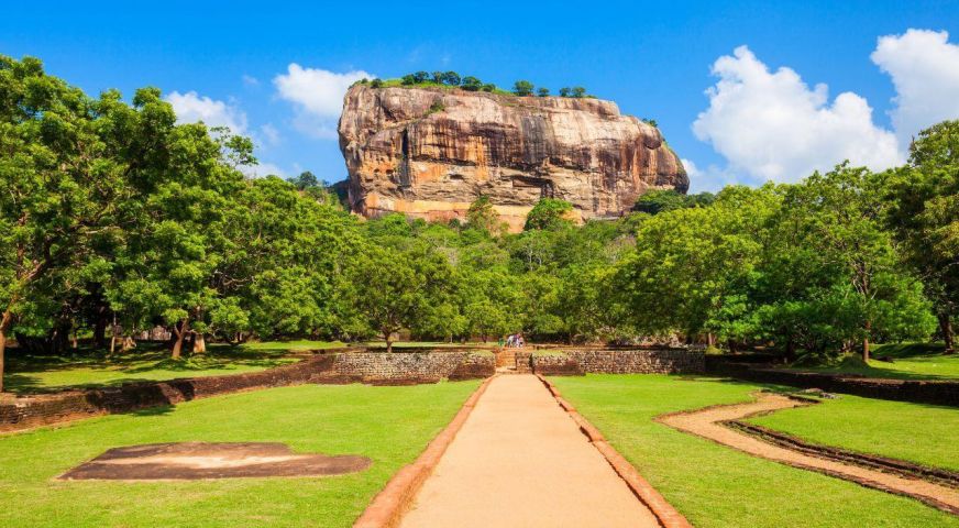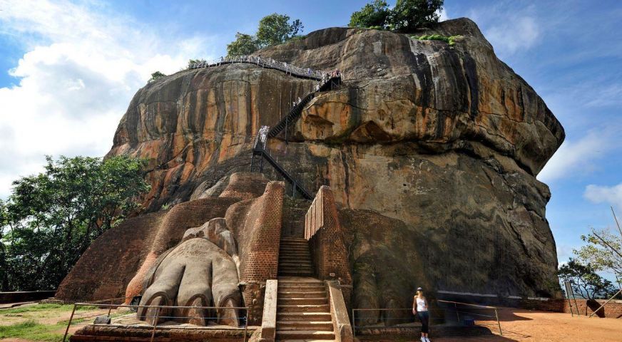 Извисявайки се на 180 метра височина, тази величествена скала приютява на върха си останките от царски дворец от V век, обграден от сложна система от висящи градини, водни басейни и панорамни тераси, откъдето се разкриват безкрайни гледки към джунглата на Централна Шри Ланка.