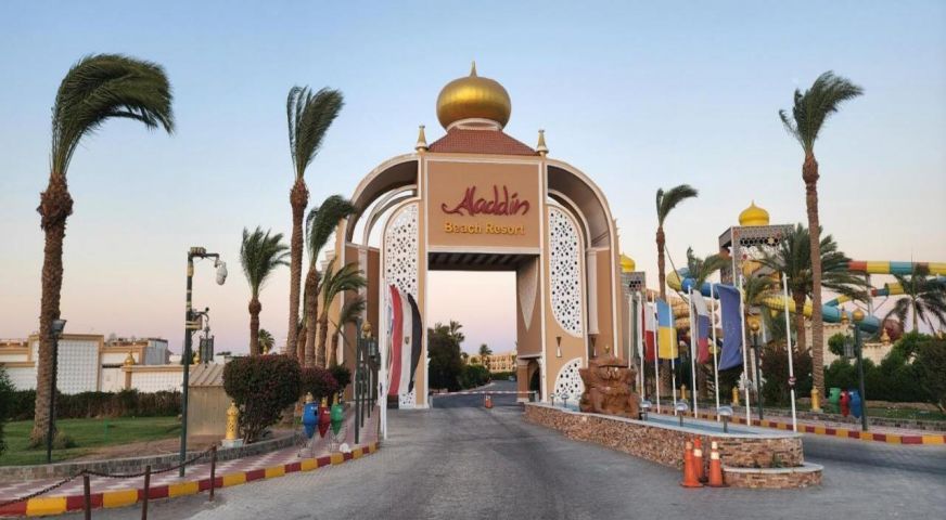 Aladdin Beach Resort 4* се намира на самия бряг на Червено море, в курортната зона на Хургада. Разположен е на около 8–12 км от международното летище и на приблизително 15 км от центъра на града. Хотелът е част от комплекс заедно с съседните Jasmine Village и Ali Baba Palace, с които споделя определени удобства.