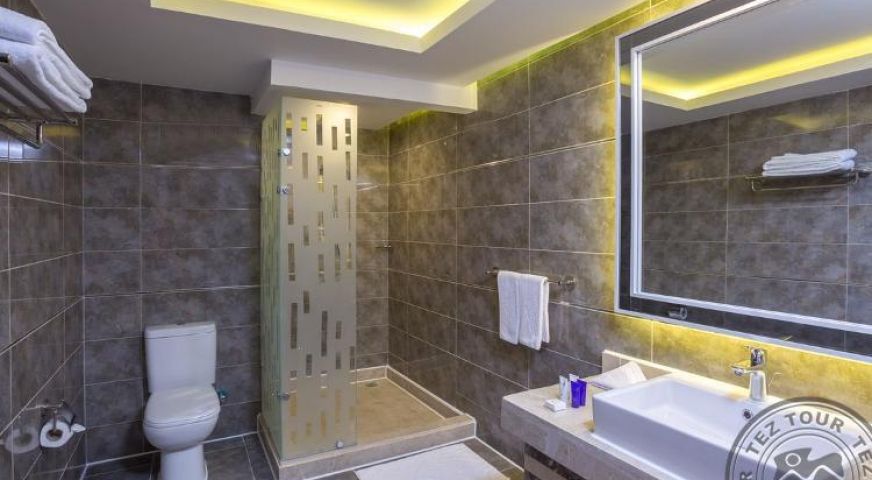 Фамилна стая (гледка към басейн/градина, 82 м2, включително 2 спални с врата, баня и балкон/тераса).Има и 02 стаи за хора с увреждания.