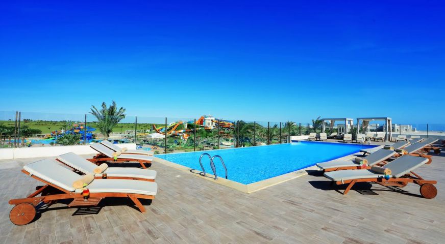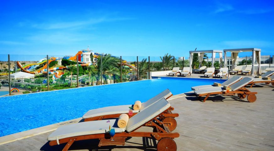 Задължително доплащане за Makadi Aqua Park при плащане на резервацията. Доплащане за Makadi Aqua Park за възрастни € 35,00 (неограничено ползване по време на целия престой в хотела), за деца от 00-02,99 г. безплатно, за деца от 03-12,99 г. 25€ за престой.
