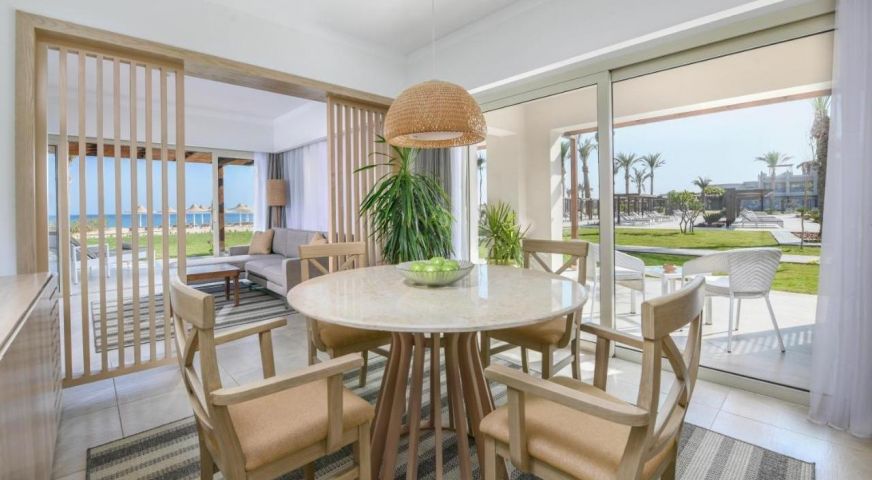 - SUITE FRONT SEA VIEW – 120 кв.м, една стая с двойно легло, диван, трапезария, баня, тераса с директен изглед към морето и достъп до плажа.