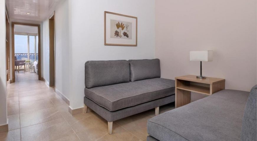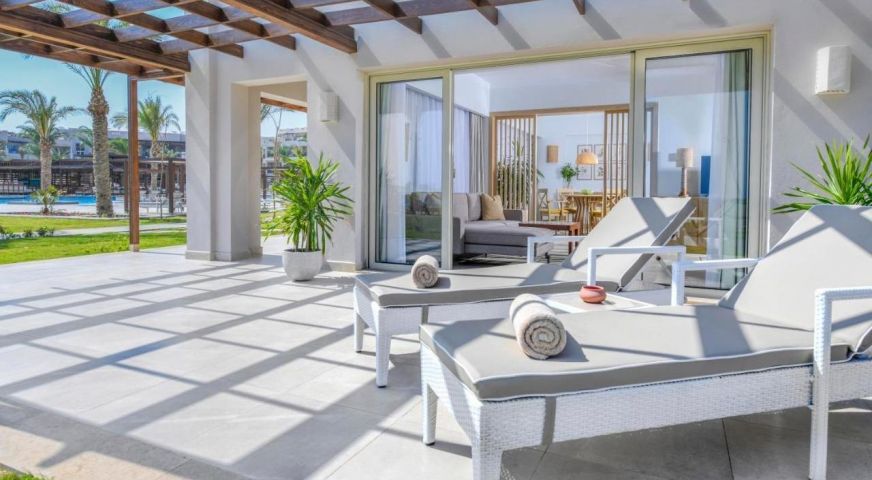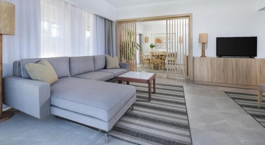 - DELUXE FAMILY ROOM POOL & SEA VIEW- 45 кв.м, една стая с двойни или две единични легла, два дивана, баня, тераса с изглед към басейна и морето.