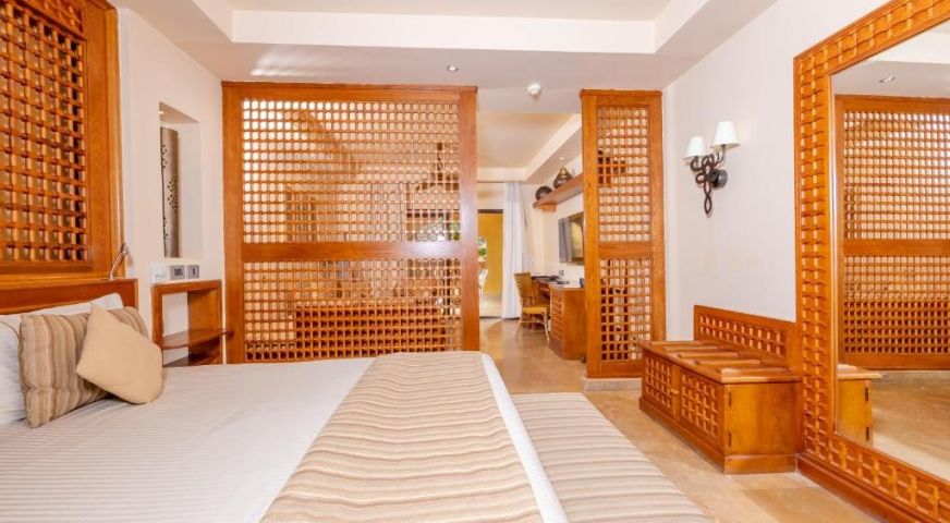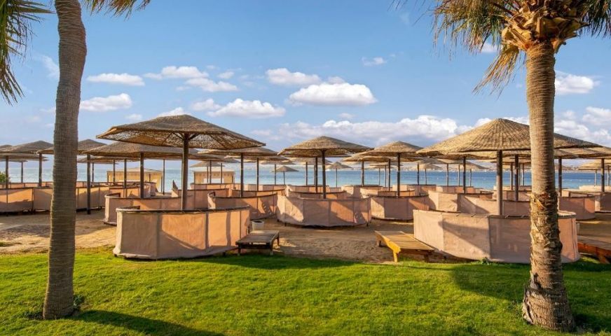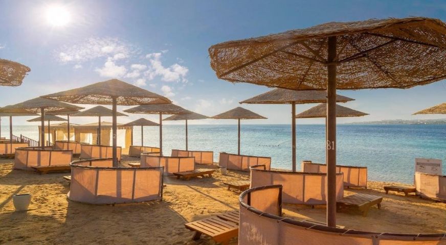 Плаж: Широк, частен пясъчен плаж точно пред хотела, осигурени шезлонги и чадъри, кърпи за басейн/плаж, бар на плажа.