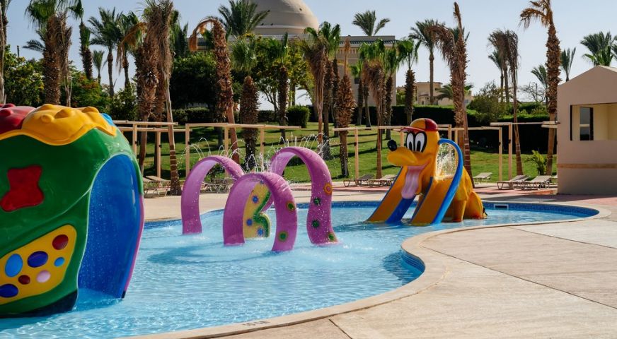 Собствен, пясъчен и коралов плаж, с платформа. Основен басейн, комбиниран с детски басейн, басейн „Серенити“. Аквапарк с 6 различни пързалки за деца и възрастни, работно време 10:00 - 13:00 ч. и 14:30 - 17:00 ч. Чадъри, шезлонги и плажни кърпи на плажа и при басейна се ползват безплатно
