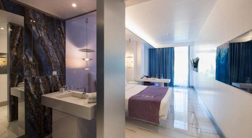 В стаите: Стаята разполага с телефон, сешоар, сателитна телевизия. Почистването се извършва ежедневно, има балкон. Електрическа кана се предоставя при поискване. Спалното бельо се сменя през ден, а кърпите се сменят ежедневно. Стаята разполага с мраморна вана и сейф. Подът е с плочки, осигурени са и аксесоари за баня. Wi-Fi е безплатен. Климатикът е индивидуален, а минибар може да се поръча при поискване. В стаята има още халат и чехли.