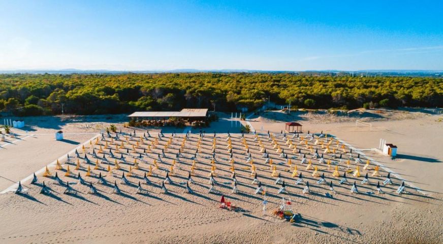 Плажът е част от комплекса с безплатни чадъри и шезлонги за клиентите. За да го достигнете, преминавате през прекрасна романтична зелена борова гора по обособени пътеки, или с минибусчета, които се движат през целия ден. Плажът е дълъг и широк, с фин пясък и безплатни чадъри и шезлонги.