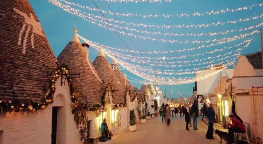 Алберобело – посещение на приказната столица на трулите. Алберобело е град с толкова особено обаяние, че е трудно да се ориентирате къде се намирате. Столицата на Трулите сякаш ви пренася в детска книжка с приказки. Трулите са малки бели къщички от варовик с конусовидни покриви. Градени в миналото без всякаква спойка, те наподобяват по форма ескимоско иглу. В близост до главния площад се намира църквата „Санта Лучия”, както и градския музей „Територио”. Музеят е направен от 10 трули обединени в една. В музея може да се види историята на създаването на трулите и как обитателите им са живеели в тях в миналото. Алберобело има и други музеи, които предлагат на туристите сувенири и почти всичко, което една селска къща произвежда. Някой от поинтересните са: Музея на виното и Музея на зехтина. В цената е включена дегустация на домашно произведени ликьори и сладки. Локоротондо – едно от 100-те най-красиви малки градчета в Италия, чийто историческия център е застроен в овална форма, откъдето идва и името му. Градът е записан в книгата на рекордите на Гинес, заради петте гласни „о“ в името си. Това е град на красивите балкони, повечето от които си имат номера. Градът е известен и със своите вина.