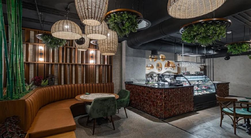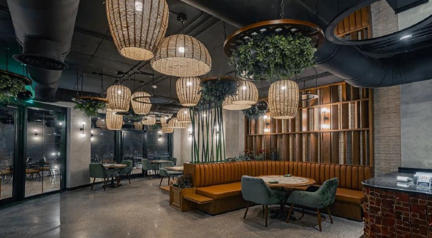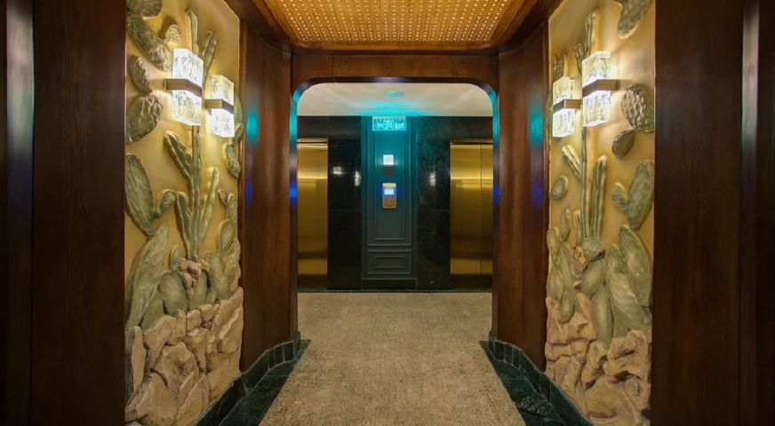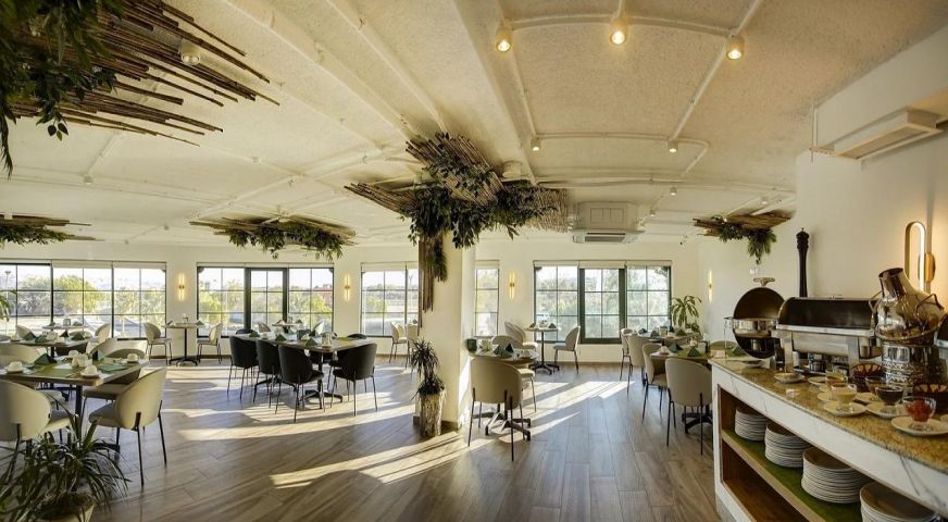 Съвременна сграда с добре поддържана фасада, лоби и ресторант зона („La Firma“), предлагаща природно-успокояваща атмосфера ;