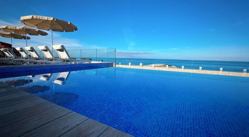 Градски, пясъчен. Чадъри и шезлонги при басейна – безплатно, на плажа – срещу заплащане.