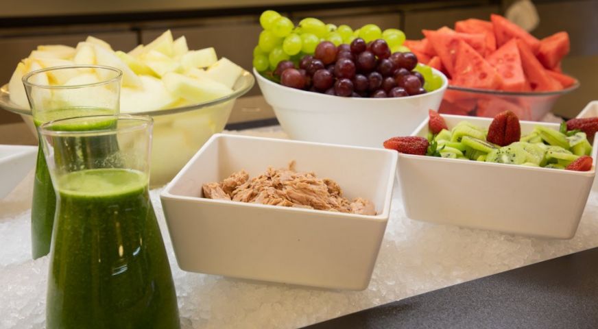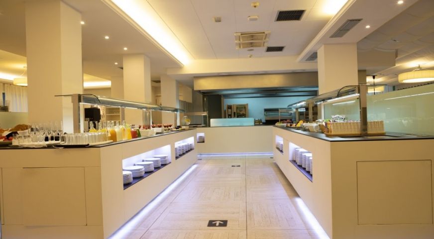 На територията на хотела: Външен басейн и инфинити басейн на покрива на хотела (безплатен за клиенти Клуб Селект или срещу допълнително заплащане 35 евро на ден, с включени напитки). Бюфет- ресторант, който предлага интернационална и средиземноморска кухня, кафе-бар Лес Палмерес, където можете да се насладите на типични тапас и коктейли. Барът до основния басейн е отворен от 09:00ч до 00:00ч и също предлага коктейли, междинни хранения и алкохолни и безалкохолни напитки.