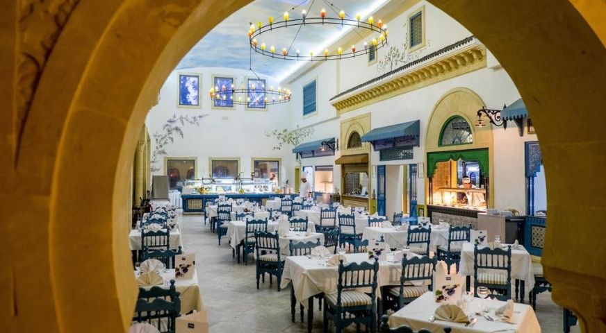 На територията на хотела: Основен ресторант Zeituna, 4 тематични а ла карт ресторанта, всеки от които може да бъде посетен безплатно веднъж по време на престой след предварителна резервация (в хотел Medina Belisaire & Thalasso със средиземноморска кухня, в хотел Medina Diar Lemdina с мароканска кухня, в хотел Medina Solaria & Thalasso с италианска кухня, в ресторант Shaherezade” в хотел Medina Diar Lemdina с тематична вечеря 1001 нощи), лоби бар Shark Bar, бар басейн, плажен бар, мавританско кафене (срещу заплащане), 2 открити басейна, 1 закрит басейн, Таласо център, денонощна рецепция, 4 конферентни зали, обмяна на валута, анимация.