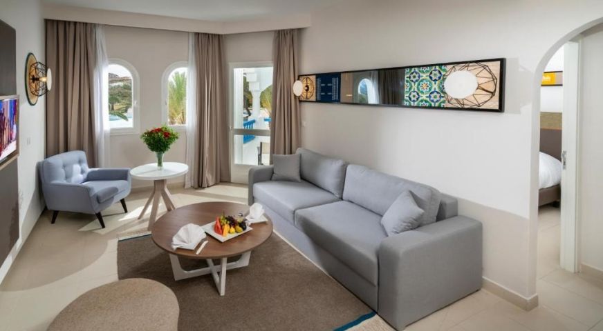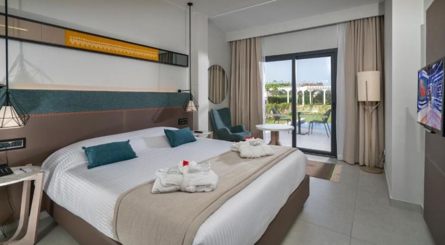 В стаите: Хотелът разполага с 322 стаи, разпределени в триетажна сграда (без асансьор) и комплекс от бунгала. Всички стаи са оборудвани с климатик, телевизор, телефон, баня с душ/вана, сешоар, минибар (срещу заплащане, на запитване), балкон или тераса, Wi-Fi, сейф, халати, тоалетни принадлежности. Почистване на стаите - всеки ден.