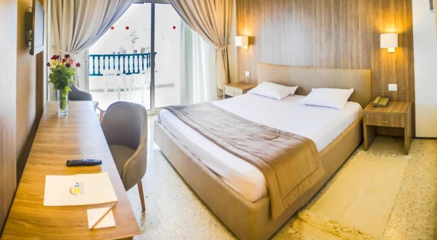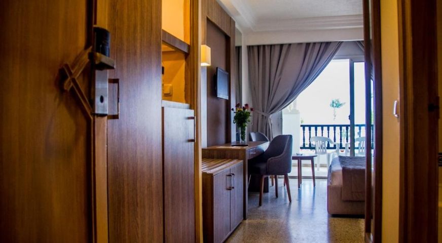 В стаите: Хотелът разполага с 504 стаи, разпределени в три сгради, като основната сграда има два асансьора - Standard Room (26 кв.м), Standard Room Sea/ Pool View (29 кв.м), Family Room Garden View (38 кв.м), Connecting Room (стаи със свързана врата), Connected Room Sea & Pool View (стаи със свързана врата и морска гледка или гледка басейн) и Suite Sea View (60 кв.м с хол). Всички стаи са оборудвани с климатик, телевизор, баня с душ/вана, сешоар, тоалетни принадлежности, минибар, сейф (платено), балкон или тераса. Почистване на стаите- всеки ден.