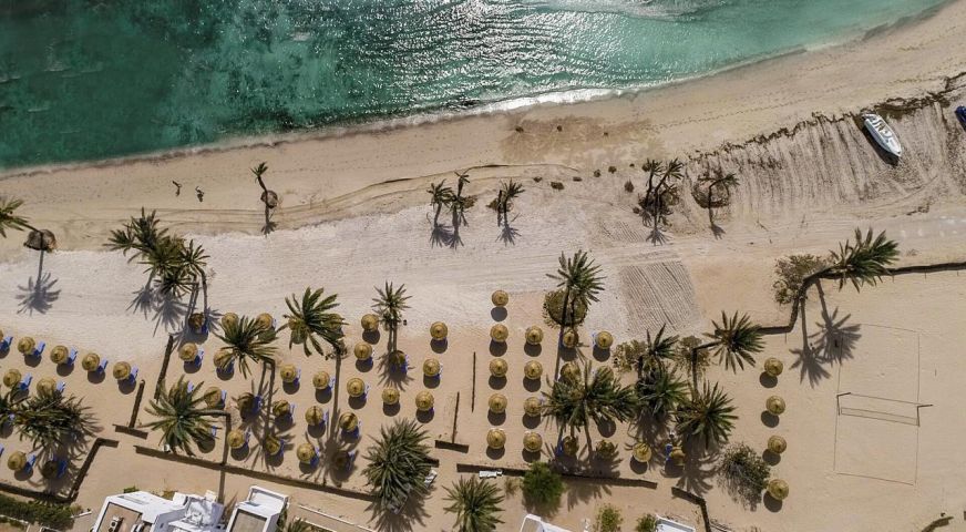Собствен, пясъчен. Чадъри, шезлонги и матраци на плажа и басейна - безплатно. Плажни кърпи - безплатно, срещу депозит.