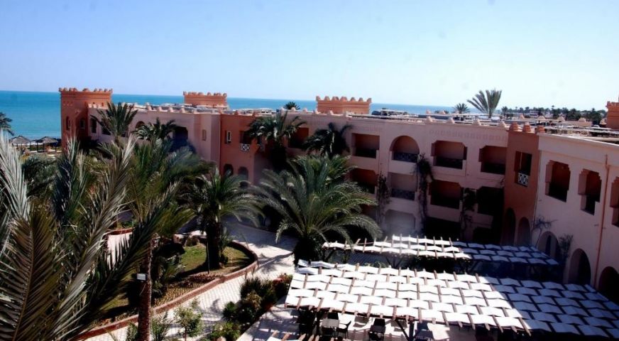 На първа брегова линия на курорта Зарзис, административна собственост на остров Джерба, на 12 км от центъра на Зарзис и на 45 км от летището.
