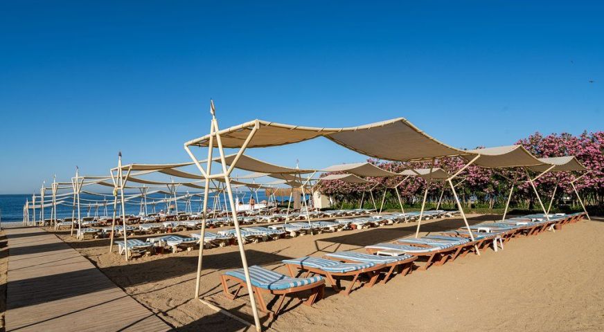Собствен, пясъчен. Чадъри и шезлонги при басейна и плажа - безплатно.