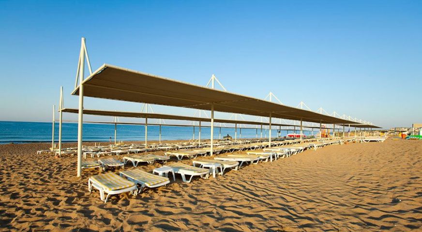собствен пясъчен плаж с дължина 200 метра. Чадъри, шезлонги, матраци, хавлии – безплатно.