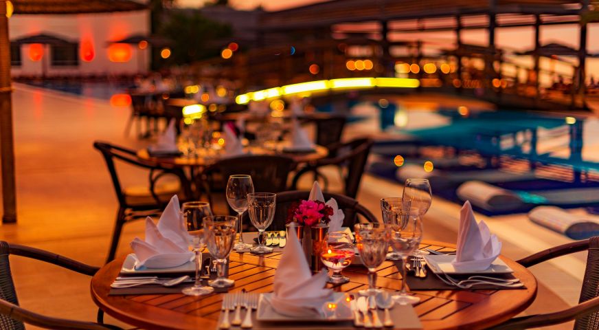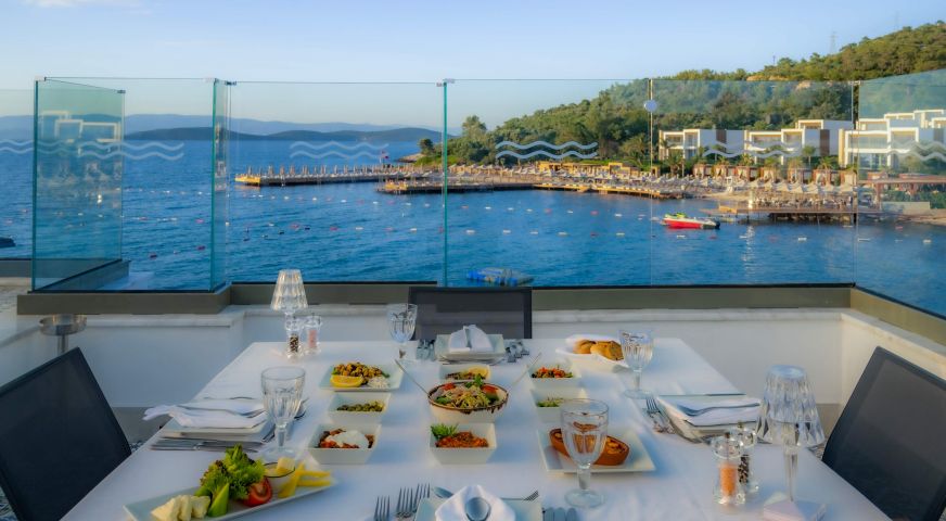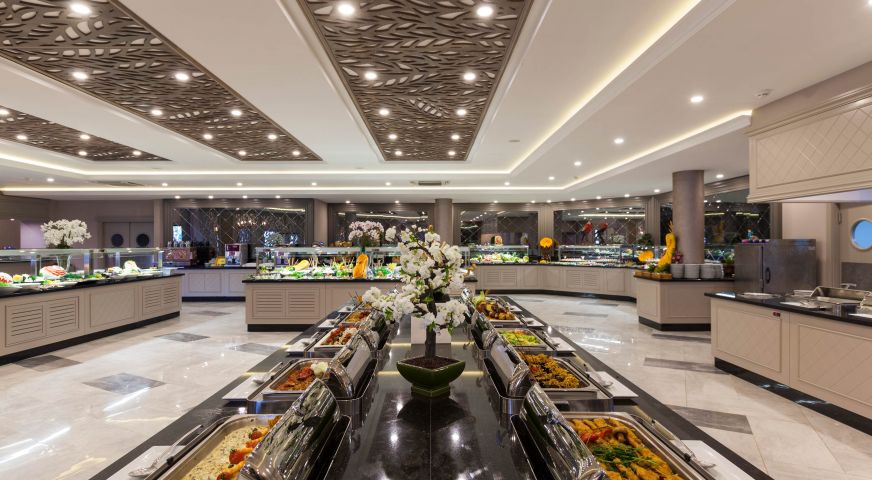 Oсновен ресторант Karya, два а-ла-карт ресторантa (турски Begonvil и рибен Teras Seafood - с предварителна резервация, едно безплатно посещение за престой от минимум три нощувки), 6 бара - Palm Bar, Roof Bar, Pool Bar, Sea Bar, Snack Bar и Olive Bar.