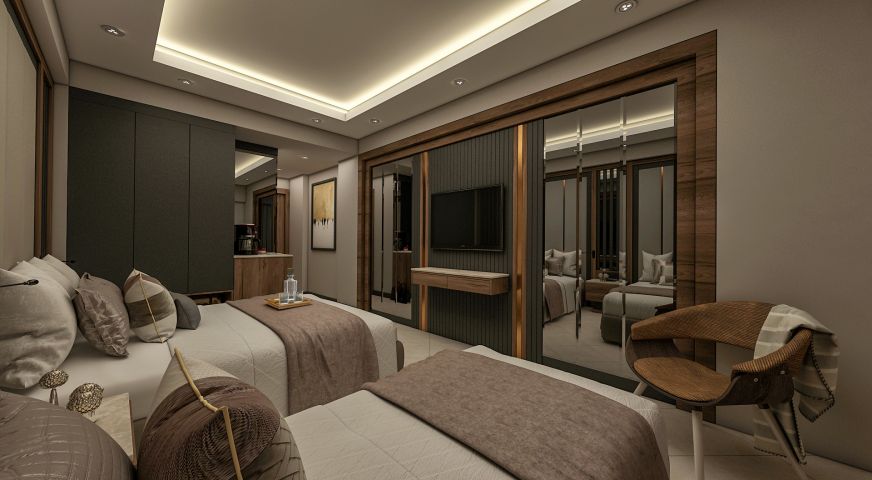 Хотелът разполага с 338 стаи, разпределени в 2 блока - 94 стандартни стаи с изглед градина (20 кв.м.), 95 стандартни стаи с изглед море (25 кв.м.), 20 фамилни стаи с изглед море (две свързани стаи, 35 кв.м.), 3 стаи за инвалиди (25 кв.м.) и промо стаи (без тераси), 37 стандартни стаи (25 кв.м.),11 лукс стаи с директен достъп до басейна (две свързани стаи, 40 кв.м.), 16 дуплекс лукс фамилни стаи (две свързани стаи, 39 кв.м.), 57 лукс фамилни стаи (две свързани стаи, 42 кв.м.), и 3 делукс суита (две свързани стаи, голяма тераса с джакузи, 61 кв.м.). Всички стаи са оборудвани с климатик, телевизор, телефон, баня с душ, сешоар, сет за чай/кафе, мини бар (платен), сейф (платен), балкон. Почистване на стаите - всеки ден, смяна на спалното бельо - 3 пъти седмично, смяна на кърпите - 3 пъти седмично.