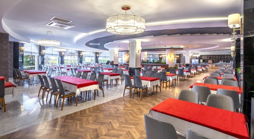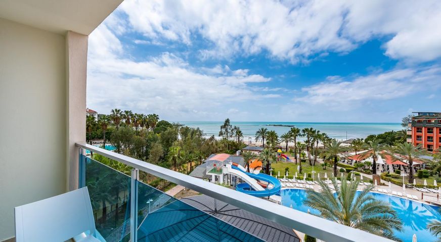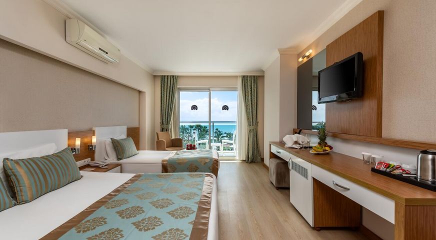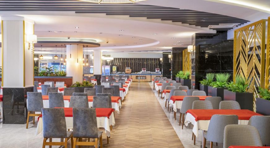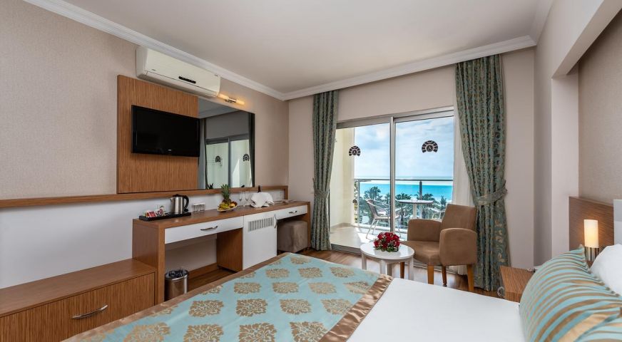 Основният корпус Hotel е построен в 2011 г., корпус Anex - през 1993 г., последно реновиран през 2011 г., обща площ 10 000 м2,. Състои се от 7-етажен основен корпус Hotel и един 7-етажен корпус, 155 standard room (макс. 2+2 чов., 32 м2)q 65 economy room (с изглед към градината или пътя, макс. 2+2 чов., 32 м2), Anex - 96 anex room (макс. 2+1 чов., 18 м2)., основен ресторант, 2 открити басейна, закрит басейн, 5 бара, лекар на повикване, фризьорски салон, магазини, пералня, 2 конферентни зали (за 100-400 чов.) БЕЗПЛАТНИ - турска баня, сауна, фитнес зала, аеробика, водна гимнастика, плажен волейбол, тенис на маса, дартс, тенис - корт с твърдо покритие, анимационни програми, билярд, дискотека (вход), безжичен Интернет (на лоби) ПЛАТЕНИ – масаж, джакузи, осветление на тенис-корта, наем на ракети и топки за тенис, водни видове спорт, интернет-кафе. Плаж - собствен, пясък. Бар на плажа - безплатно. На басейна и на плажа: чадъри, шезлонги, матраци – безплатно. Плажни кърпи :срещу депозит.