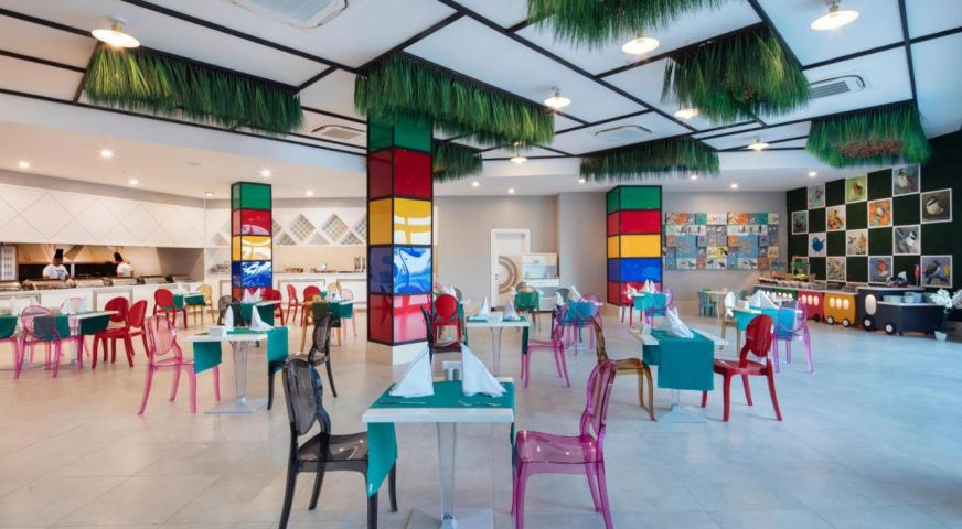А‘ ла карт ресторант с интернационална кухня (срещу допълнително заплащане); басейн с две пързалки, СПА зона; външен и вътрешен басейн за възрастни и за деца (вътрешните се подгряват), джакузи; целодневна анимация, вечерно шоу, жива музика, кино, за децата: закрит мини клуб (4-12г.), детски кът за хранене по време на вечеря, мини аквапарк, сладолед (между 14:00 и 16:00), детски басейни (закрит и открит), мини-диско, кошара.